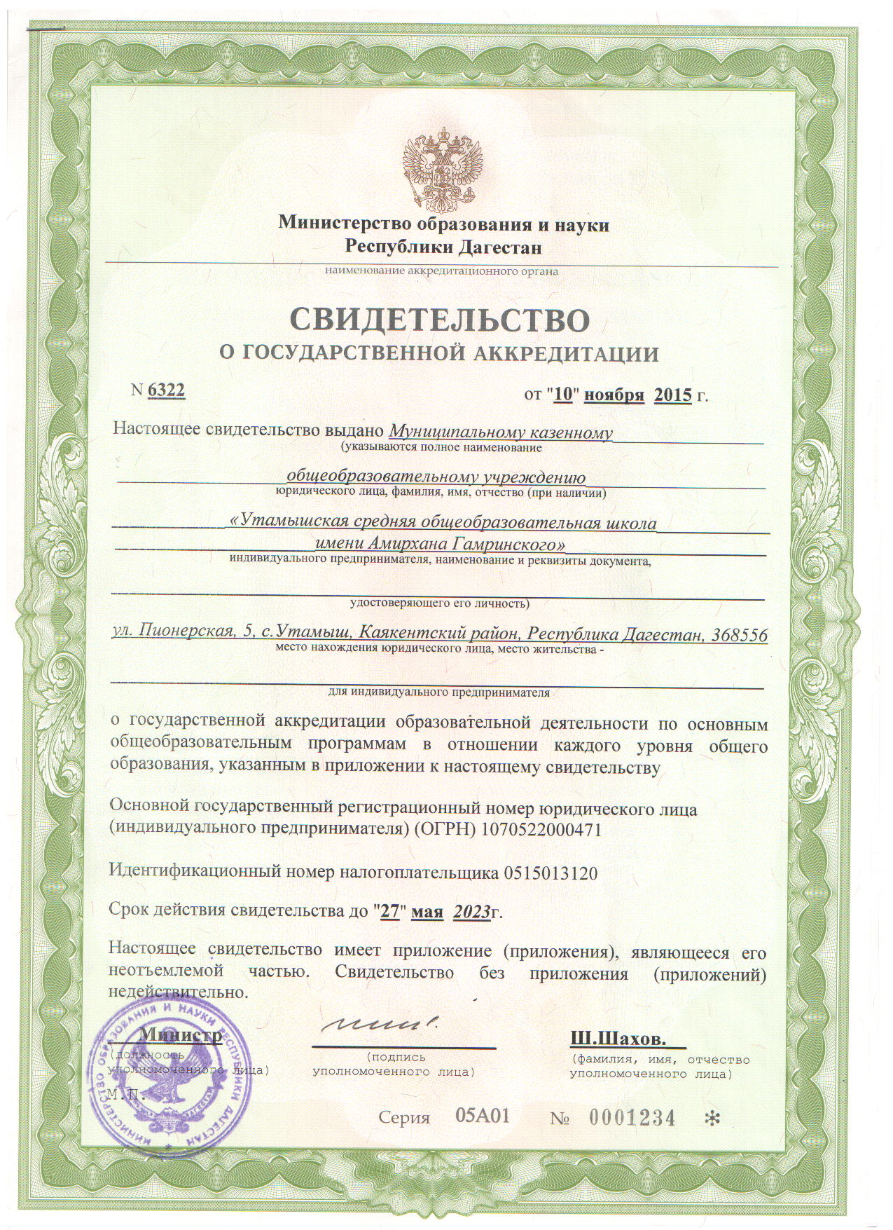 | Полное наименование образовательной организации* | Муниципальное казённое общеобразовательное учреждение "Утамышская средняя общеобразовательная школа имени Амирхана Гамринского" |
